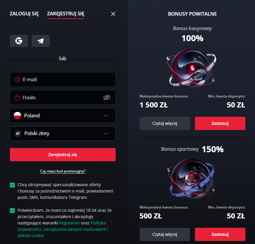 3. Wprowadź kod promocyjny (opcjonalnie), jeśli taki posiadasz, oraz zaznacz zgody na regulamin i politykę prywatności. Dzięki temu możesz uzyskać dodatkowe korzyści, takie jak bonusy powitalne.